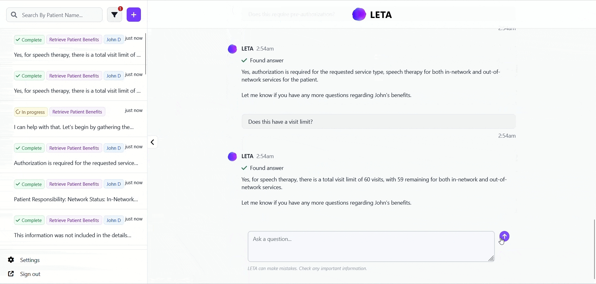 LETA is an eligibility and benefits expert who was built using 100,000+ health plans and 30+ years of experience verifying benefits. LETA automates the verification of benefits work flow for your staff.
